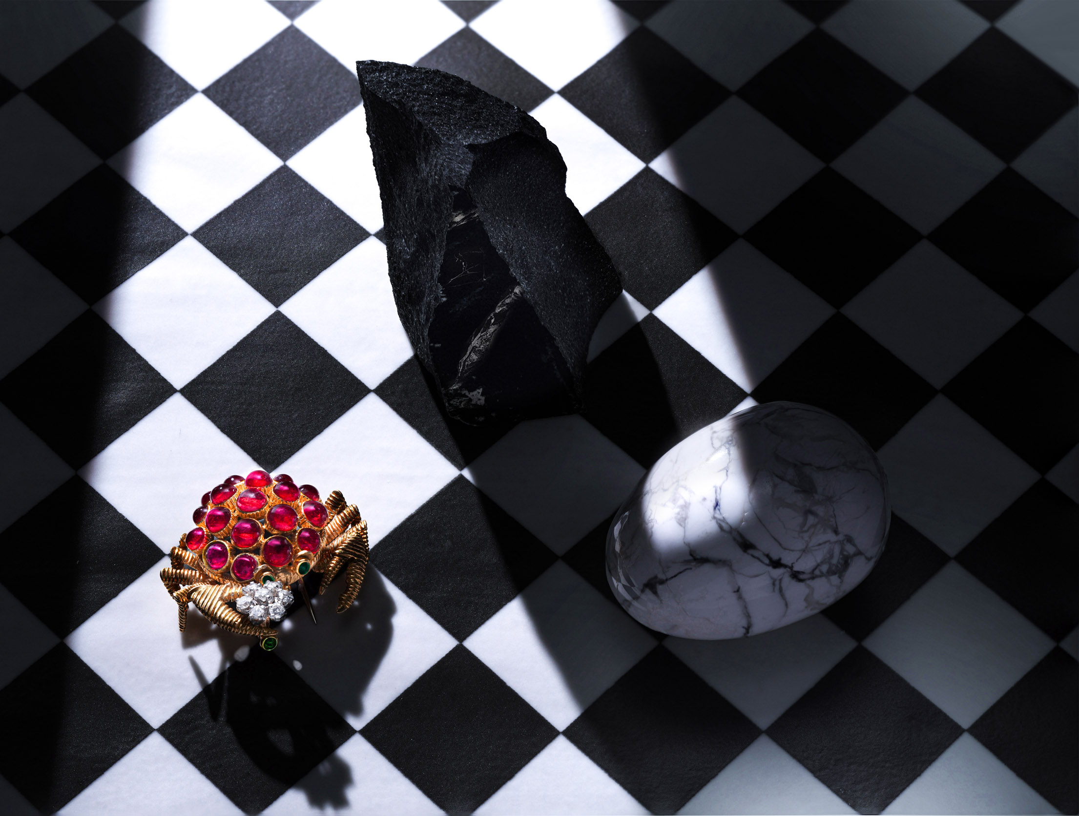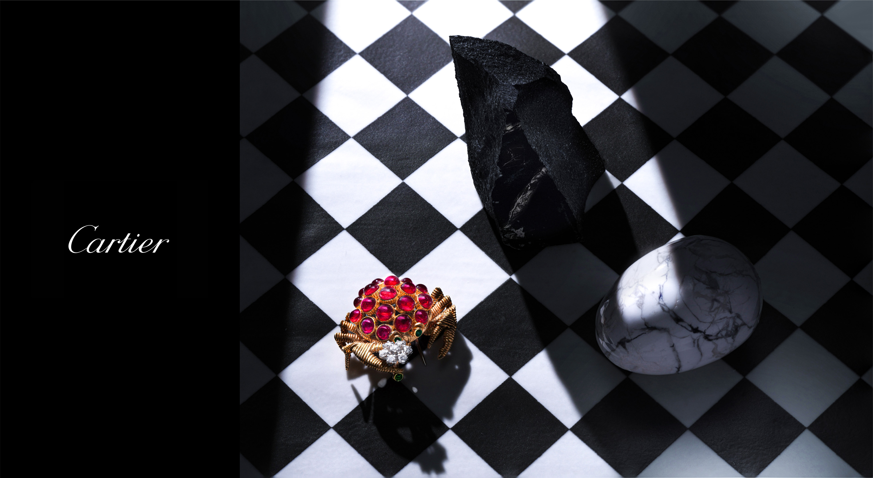 A Cartier advertisement showcases a jeweled crab brooch with ruby, diamond, and gold details on a black-and-white checkered floor. Accompanied by a black rock and marble-like stone, dramatic lighting casts sharp shadows, creating a surreal, luxurious scene that highlights Cartier's artistry and bold, imaginative design.